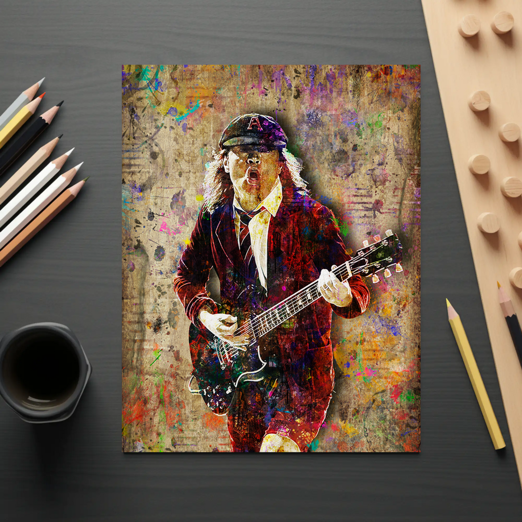 Celebrate the electrifying energy of Angus Young, the iconic lead guitarist of AC/DC, with this striking premium art print. Featuring bold detail and a vintage rock-inspired design, this poster is perfect for fans of classic rock, guitar legends, and AC/DC’s unmistakable high-voltage sound. It adds attitude and style to any music room, bedroom, studio, living room, office, or man cave—and makes an amazing gift for any true AC/DC fan or rock music collector.
